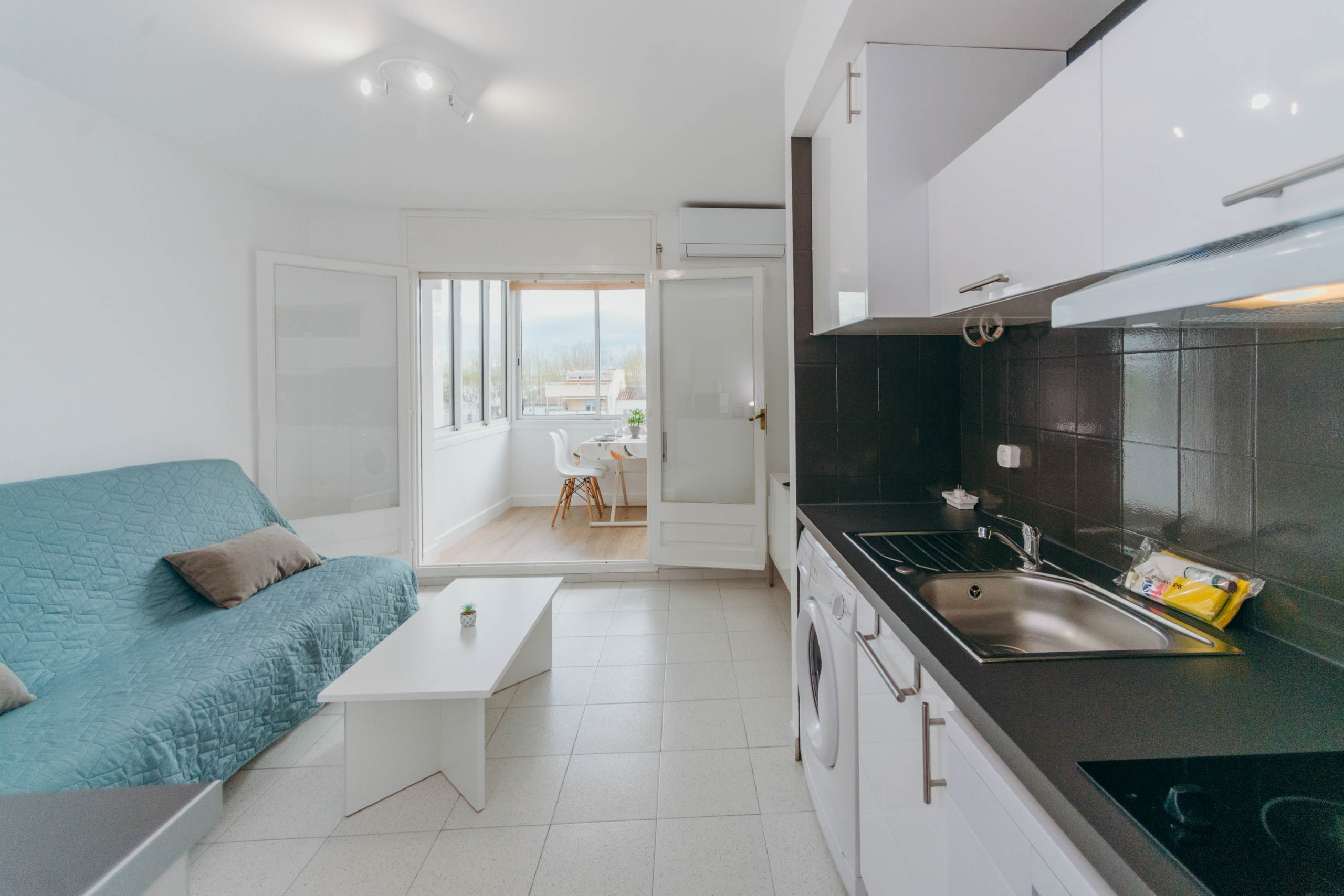 Este elegante estudio con capacidad para 4 huéspedes, es un apartamento ideal para conocer y disfrutar de la famosa ciudad de Empuriabrava. Se encuentra en la primera línea de la playa y tiene vistas al mar tanto desde la terraza, como desde la cama.. En la terraza podéis encontrar mesas y sillas para disfrutar de una cena frente al mar. La cocina americana está equipada con nevera, microondas, lavadora, vajilla/cubertería, utensilios de cocina, cafetera, tostadora y hervidor de agua. Más adelante podéis encontrar una cama de matrimonio con colchón de alta calidad y un sofá cama.