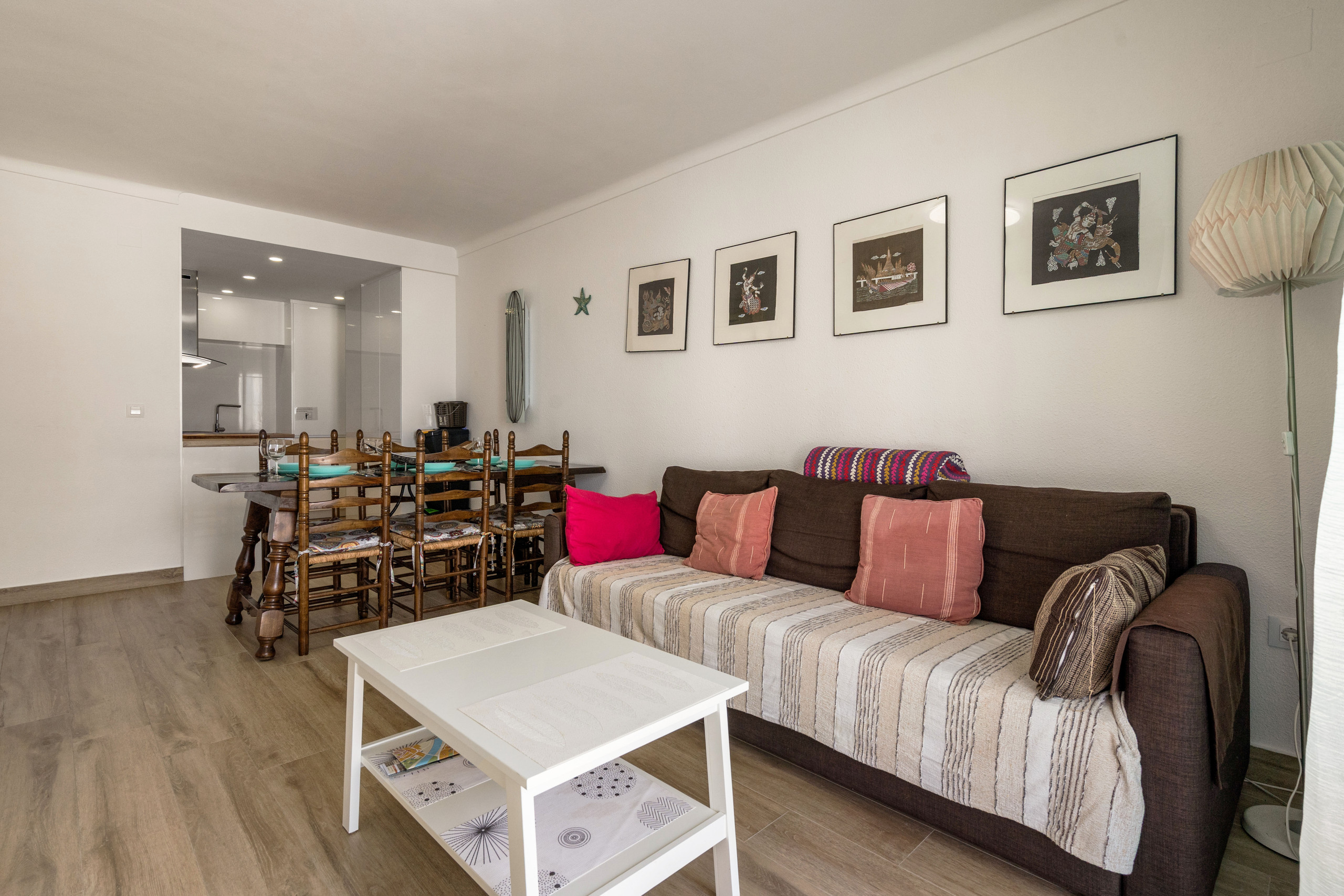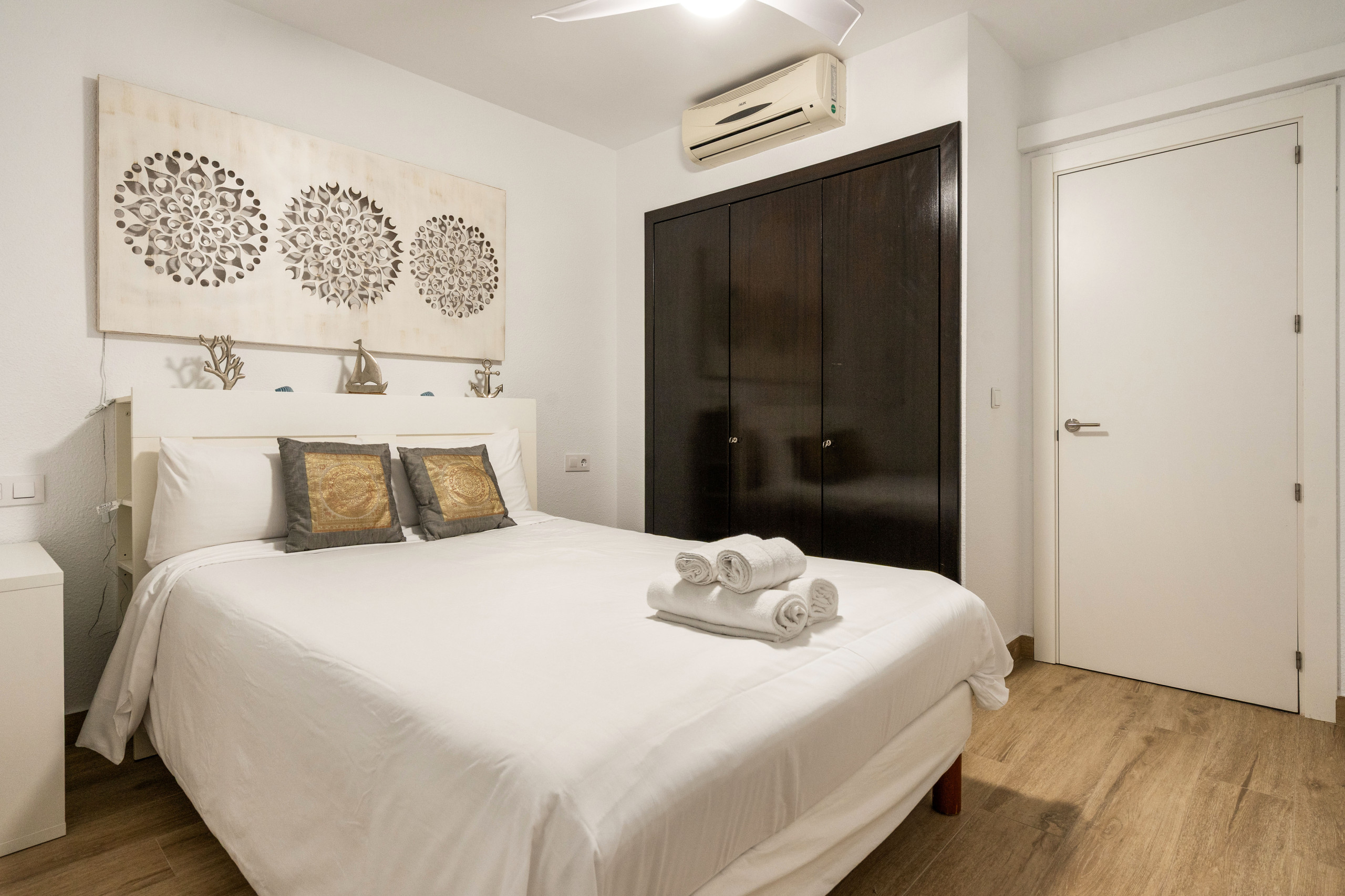Aire acondicionado, lavadora, lavavajillas, cocina equipada, ropa de cama y toallas.