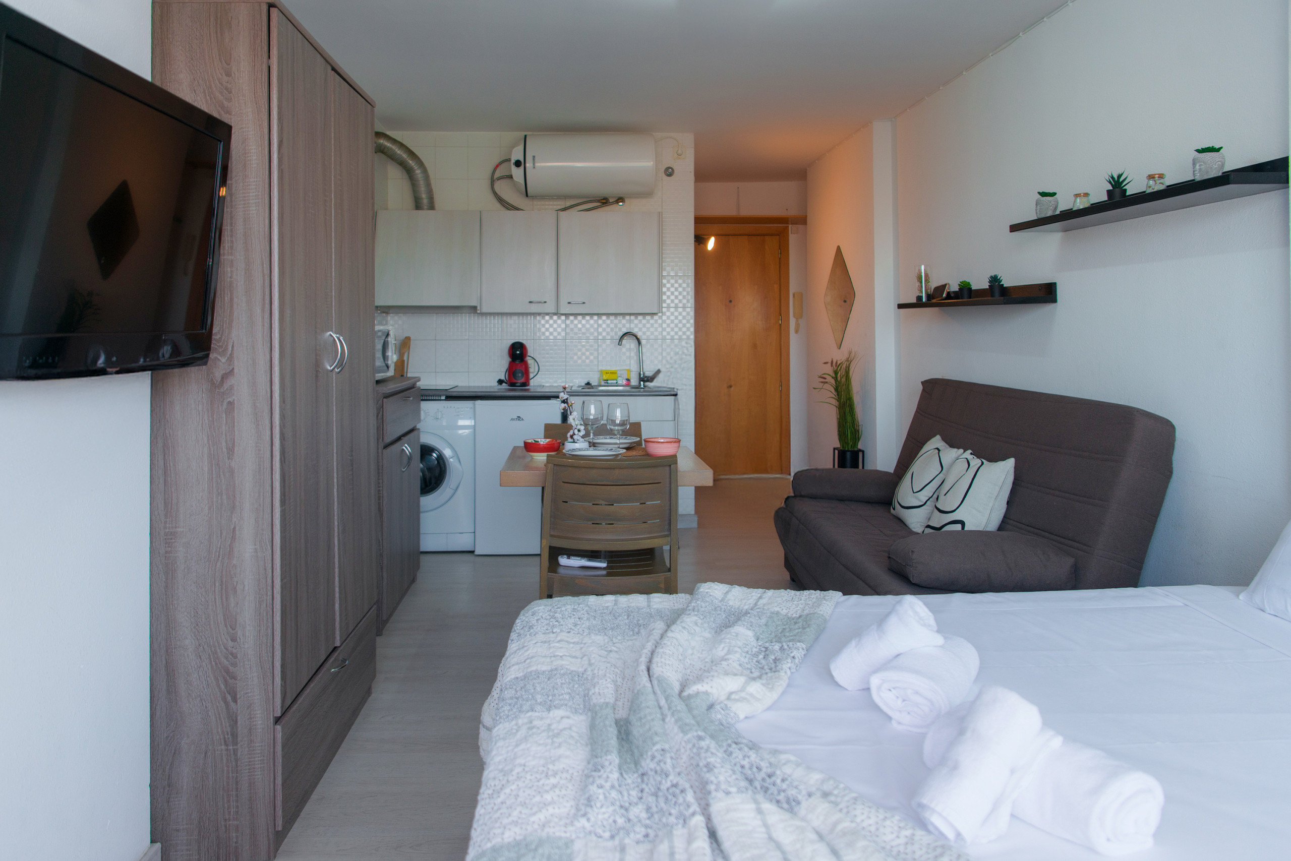 Este apartamento cuenta con una cocina completamente equipada con nevera, horno, microondas, cafetera y tostadora, perfecto para preparar tus platos favoritos. El estudio dispone de una cama doble, sofá, Smart TV y aire acondicionado, asegurando tu comodidad durante la estancia.