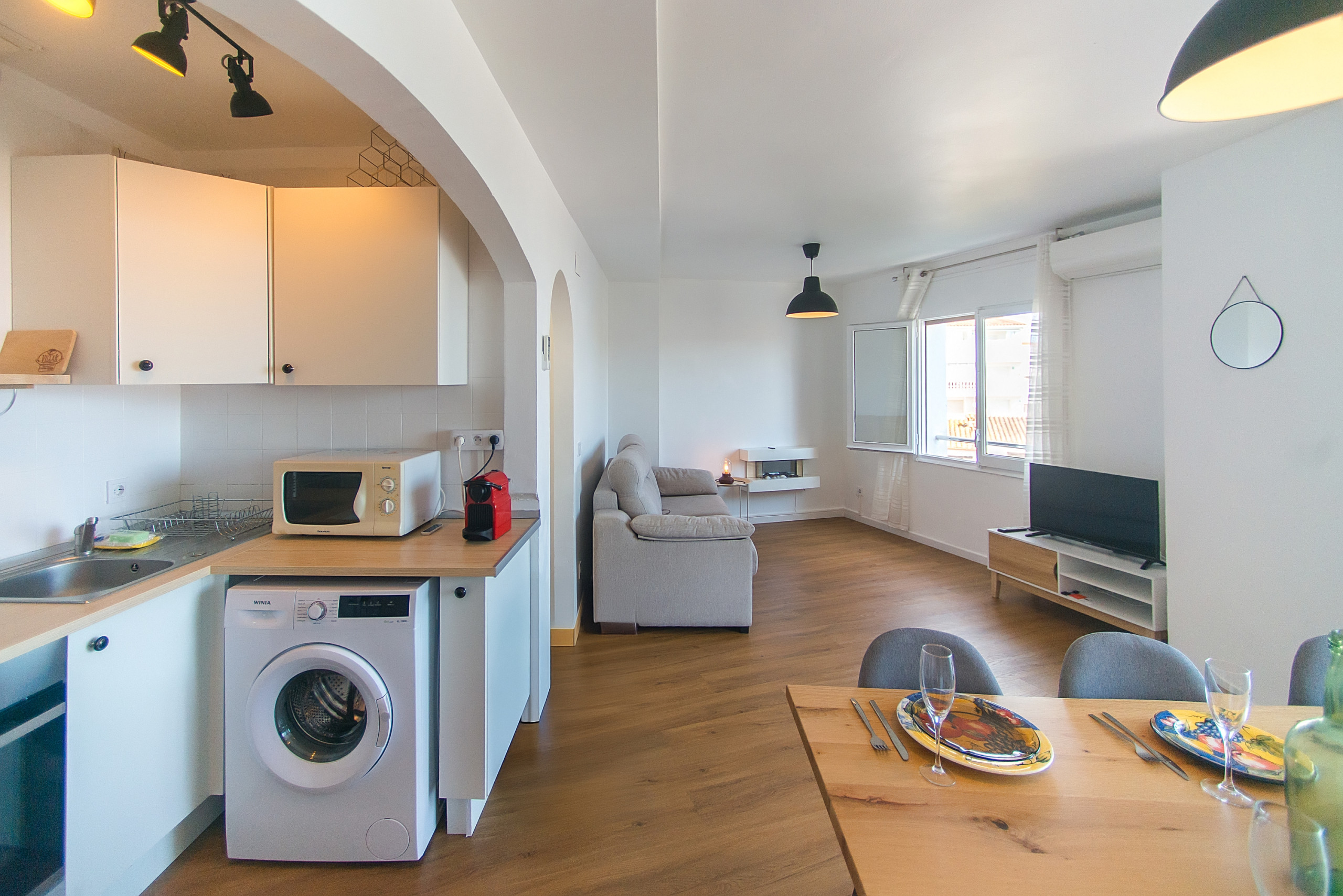 La cuina americana, de vitroceràmica, està totalment equipada amb tot el necessari per a la seva estada: nevera, forn, microones, congelador, cafetera, torradora, bullidor d'aigua, vaixella i estris de cuina. A més, disposa de rentadora, planxa i assecador de cabell per a major comoditat.