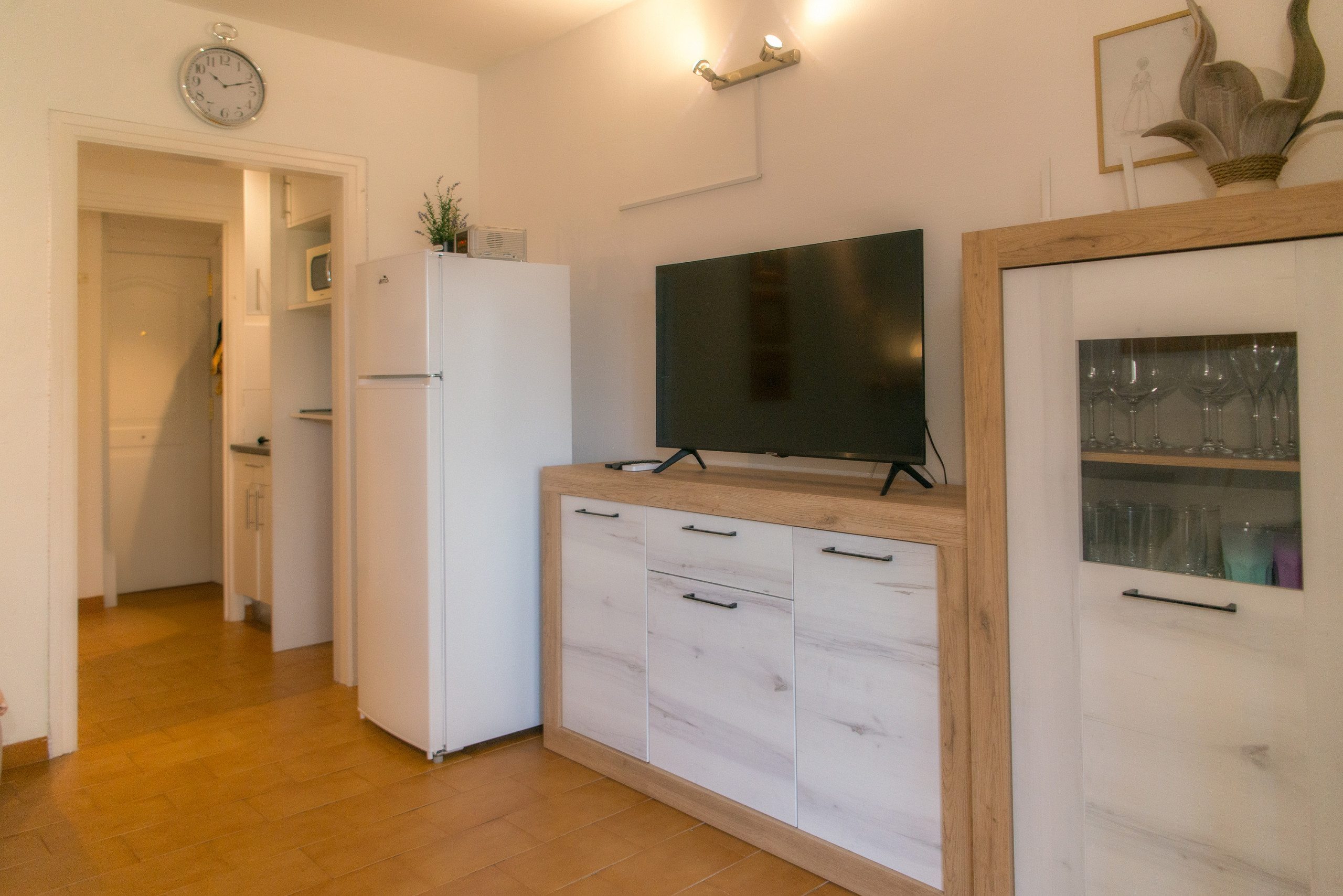 La zona d'estar lluminosa compta amb un sofà llit i una Smart TV, que dona accés a una terrassa moblada on podreu gaudir d'una tassa de cafè mentre contempleu les vistes. L'apartament disposa d'un dormitori amb llit doble i un bany.
