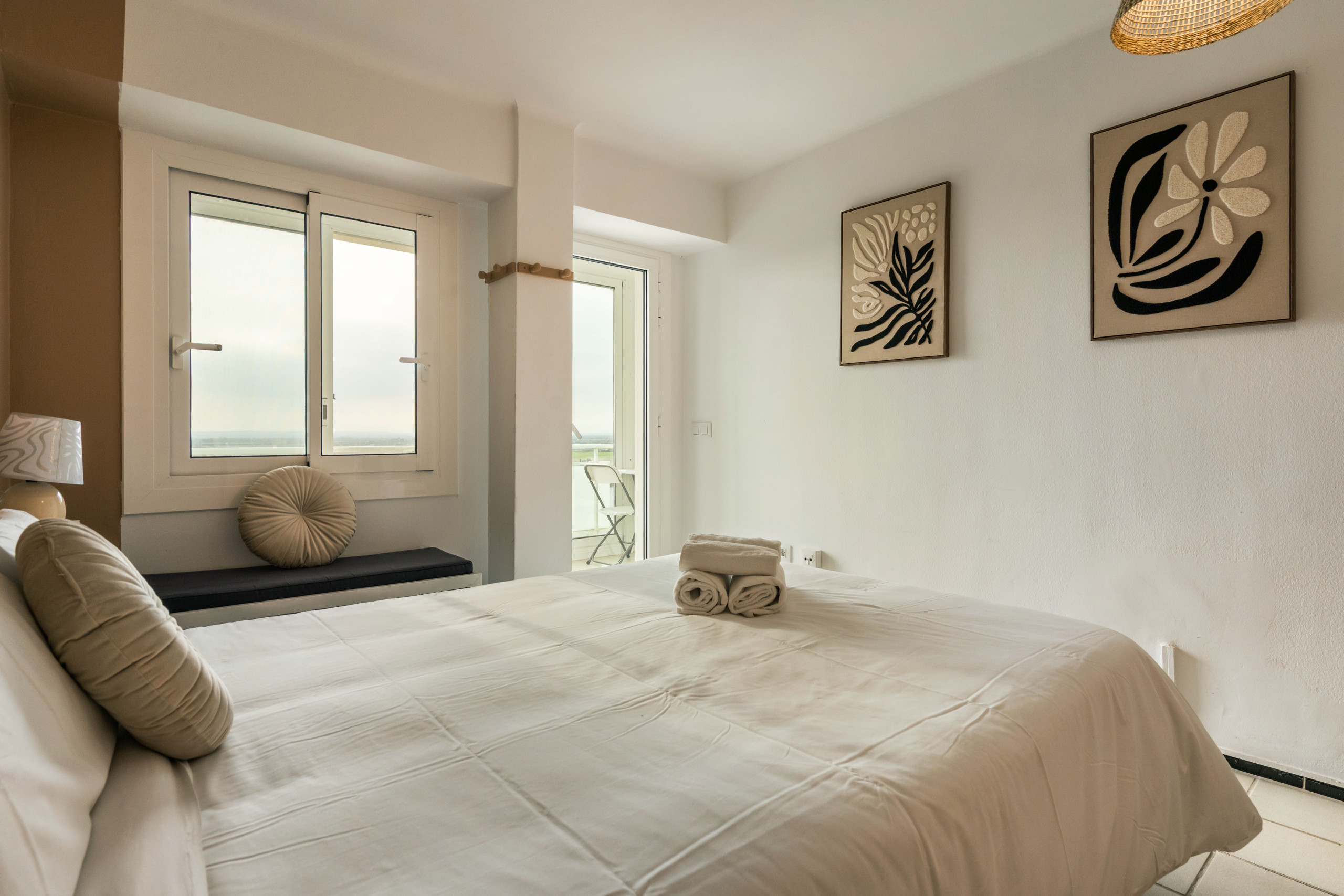 Els apartaments compten amb 2 dormitoris i un ampli saló-cuina amb finestrals panoràmics que s\'obren a una terrassa privada. L\'espai està dissenyat per allotjar còmodament fins a 6 persones, amb tot el necessari per a una estada confortable: 2 llits dobles, un sofà llit, taula de menjador, dutxa, televisió, aire condicionat, connexió WiFi i una cuina completament equipada amb nevera, fogó, microones, cafetera, torradora, bullidor d\'aigua i tots els estris necessaris per preparar els teus àpats preferits.
