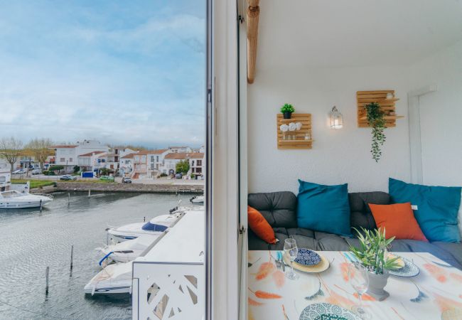 Apartament a Empuriabrava per a fins a 4 convidats, amb 1 dormitori, sofà llit al saló i vista al canal. Disposa d'aire condicionat, rentadora, rentavaixelles i cuina equipada, en una distribució pràctica per a una estada còmoda.