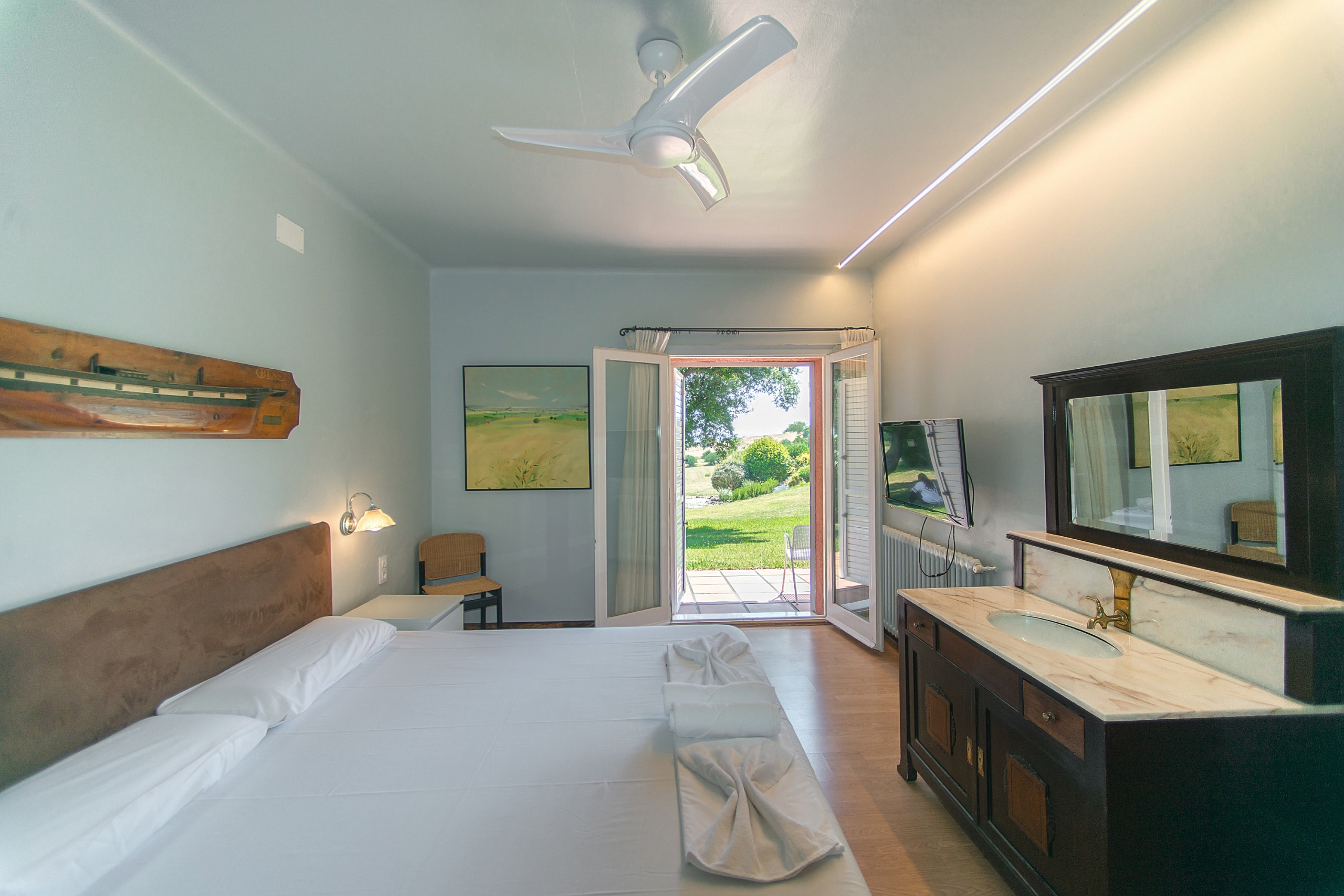 La casa ofereix cinc dormitoris acollidors, cadascun dels quals promet un somni còmode i tranquil. Tres d'ells estan equipats amb llits matrimonials i tenen sortida directa al jardí, permetent gaudir de l'aire fresc i la natura des dels primers moments de despertar. Un altre dormitori està equipat amb dos llits individuals, ideals per a nens o amics, i l'últim dormitori té un llit individual, creant un espai acollidor per a una persona.