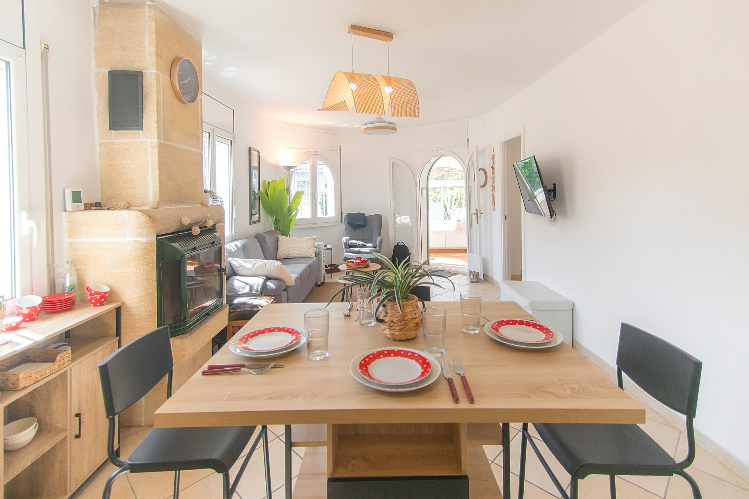 La sala lluminosa té una zona de menjador i una acollidora zona de descans amb un televisor intel·ligent i un sofà còmode, ideal per relaxar-se després d'un dia explorant Empuriabrava. La casa compta amb 4 dormitoris: tres amb llits matrimonials i un amb llitera. A més, hi ha 3 banys moderns amb cabines de dutxa.