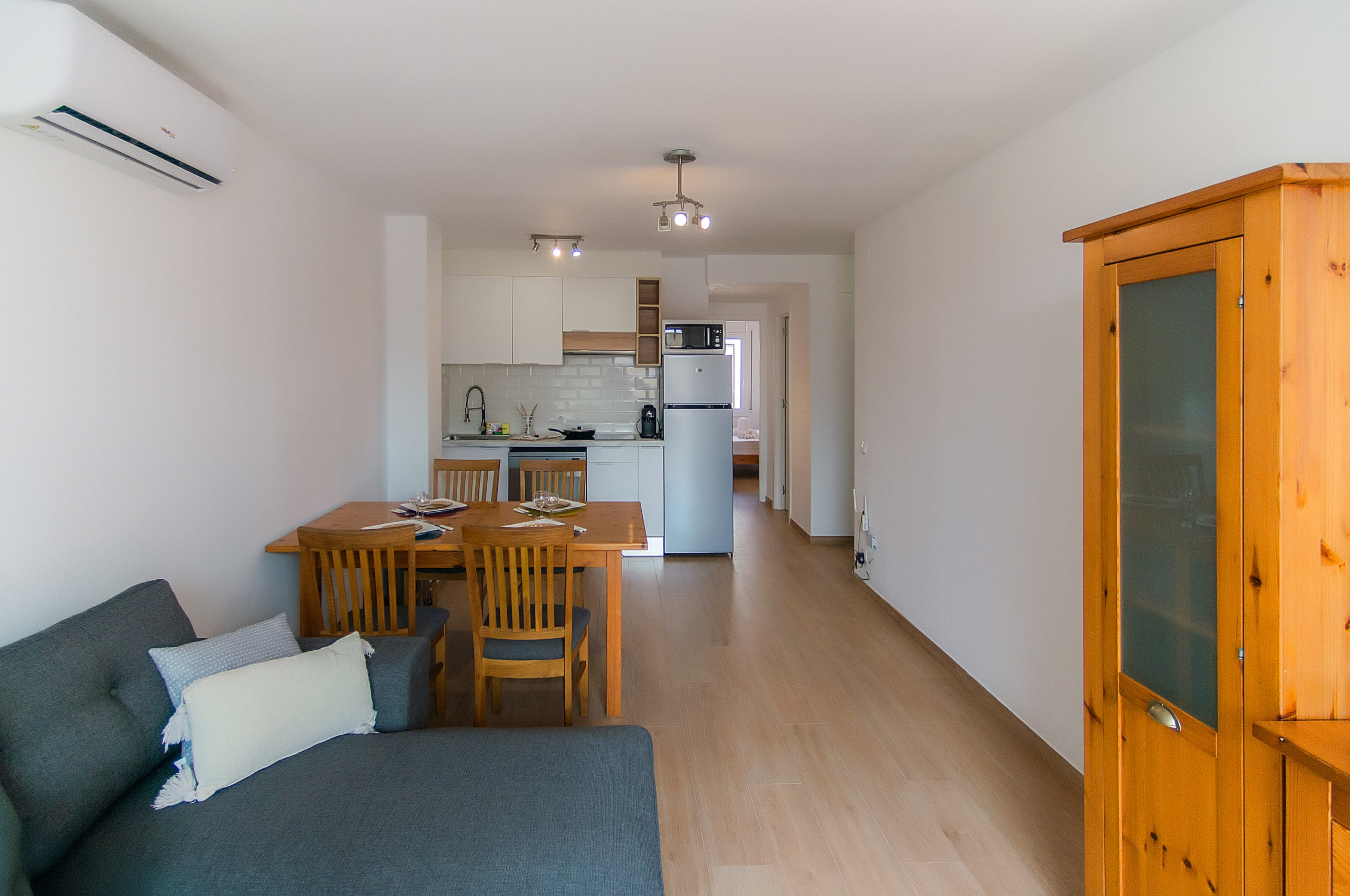 Das helle Wohnzimmer verfügt über ein gemütliches Sofa, einen Smart-TV, eine Klimaanlage und Zugang zu einer Terrasse, auf der Sie in aller Ruhe eine Tasse Kaffee genießen können. Die Wohnung hat zwei Schlafzimmer: das Hauptschlafzimmer mit einem Doppelbett und das zweite mit zwei Einzelbetten. Es gibt auch ein eigenes Badezimmer.