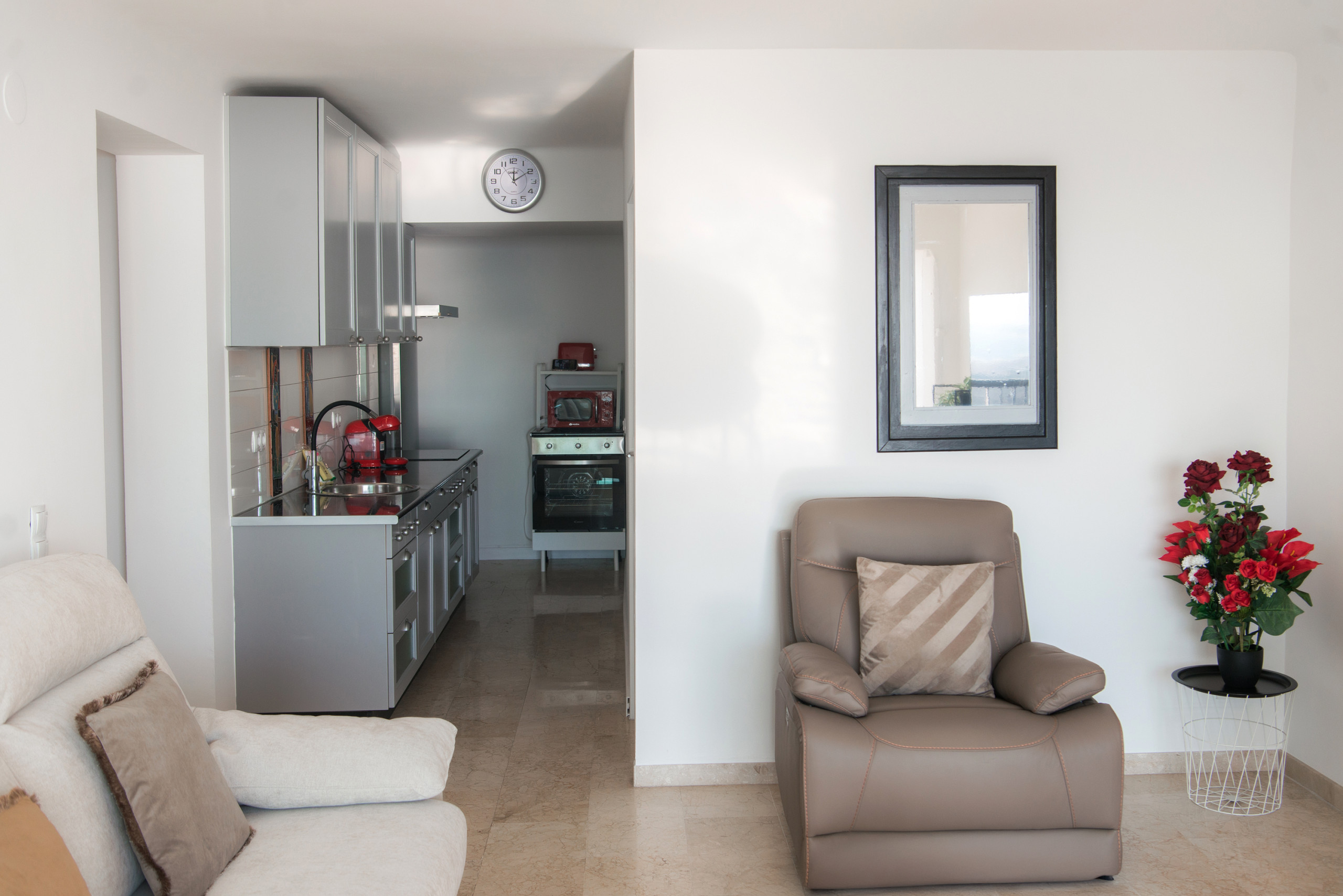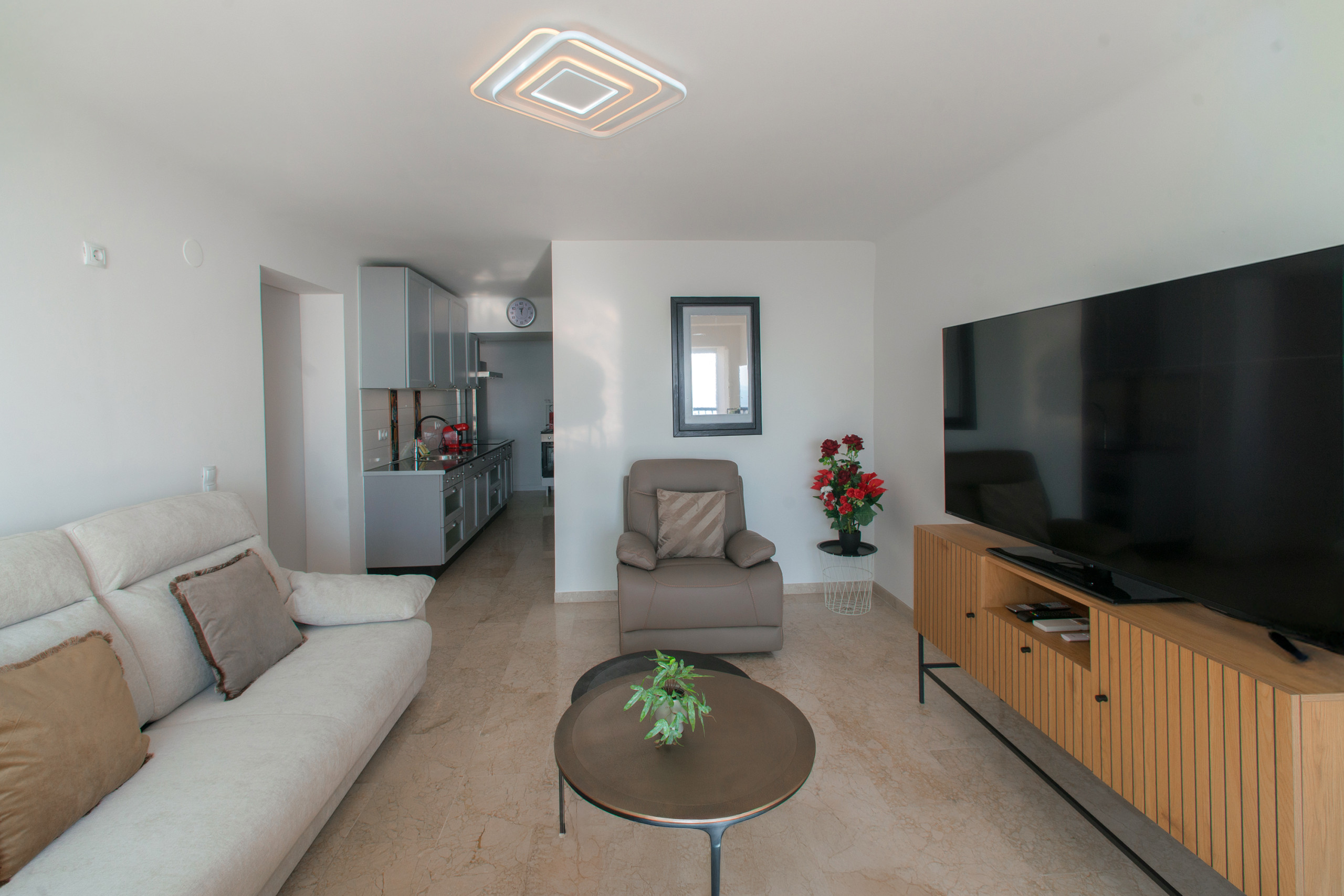 Die Wohnung verfügt über ein komfortables Schlafzimmer und ein geräumiges, funktionales Wohnzimmer, perfekt zum Entspannen nach einem Tag am Strand. Vom Balkon aus können Sie die Aussicht und die Meeresbrise genießen und jeden Moment zu etwas Besonderem machen.