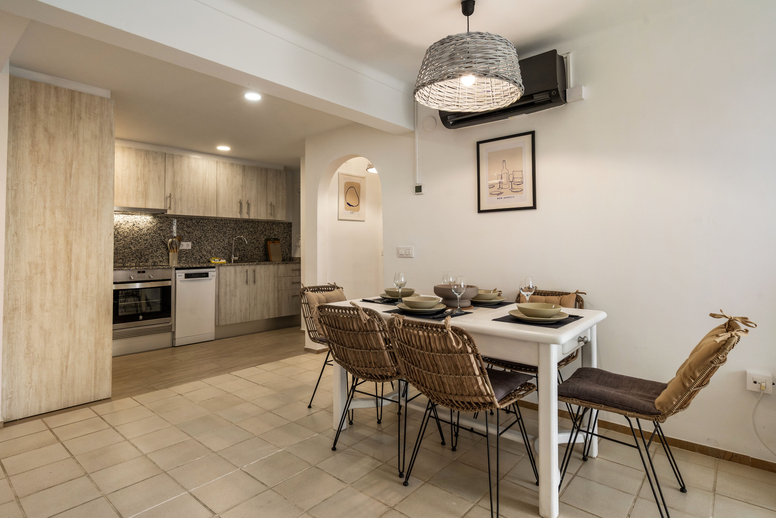 Klimaanlage, Waschmaschine, Geschirrspüler, voll ausgestattete Küche, Bettwäsche und Handtücher.