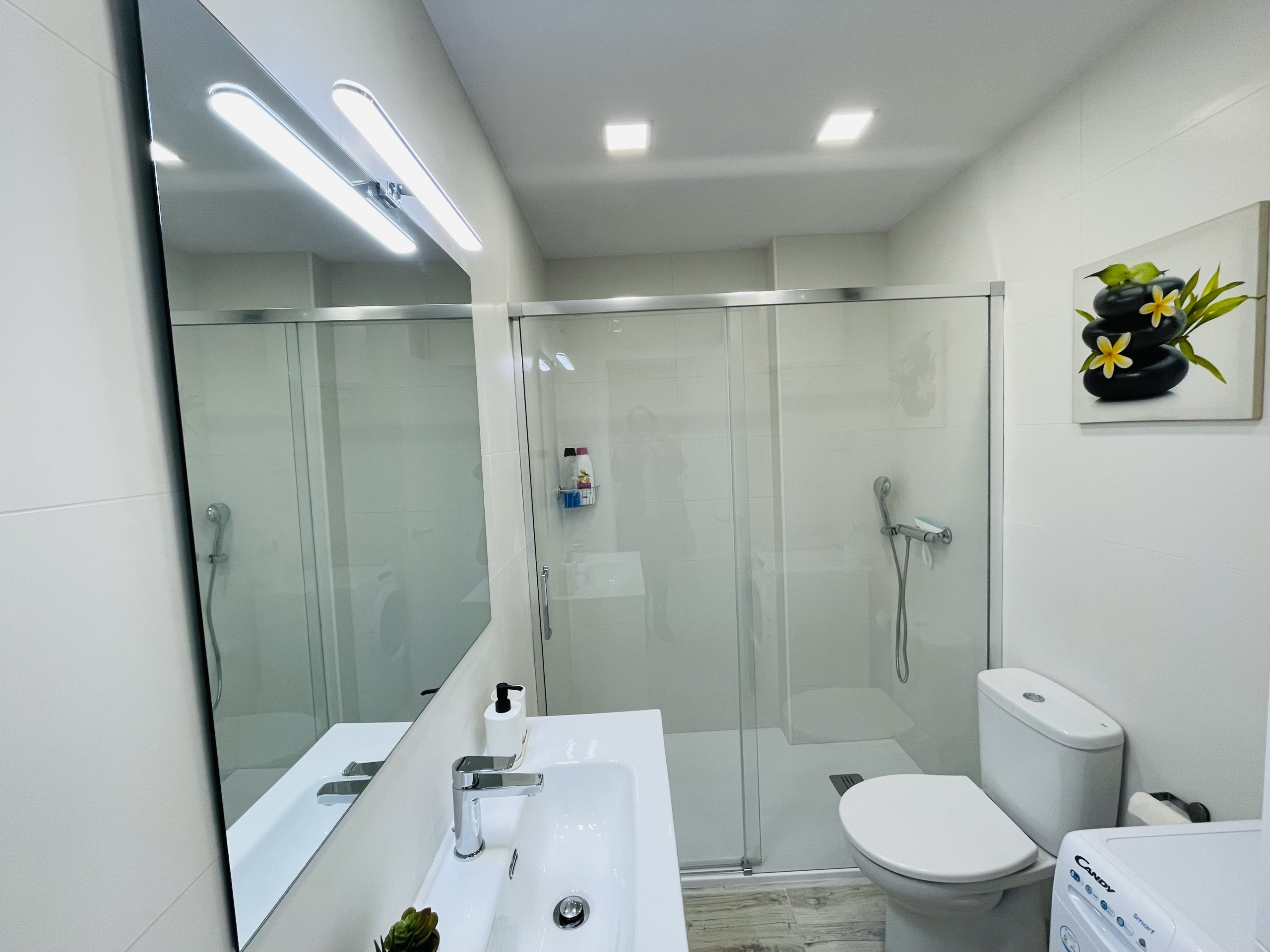 Die Wohnung verfügt über ein gemütliches Wohn-Esszimmer mit Sofa und Fernseher, das einen idealen Raum zum Ausruhen nach einem Tag am Strand oder bei der Erkundung der Gegend schafft. Von hier aus gelangt man auf eine private Terrasse von 10 m², die perfekt ist, um ein Frühstück im Freien oder einen Drink bei Sonnenuntergang mit Blick auf die Berge und die Stadt zu genießen.