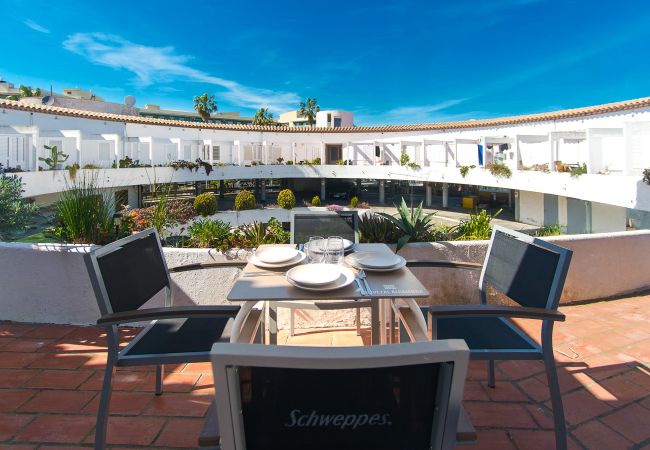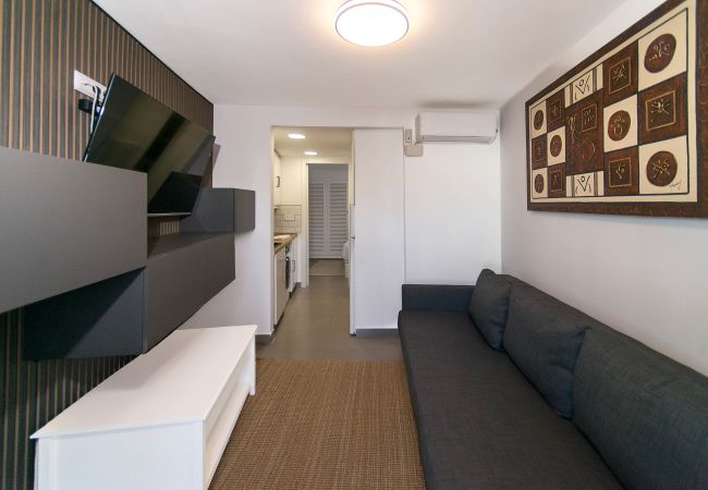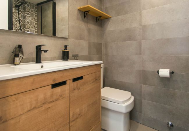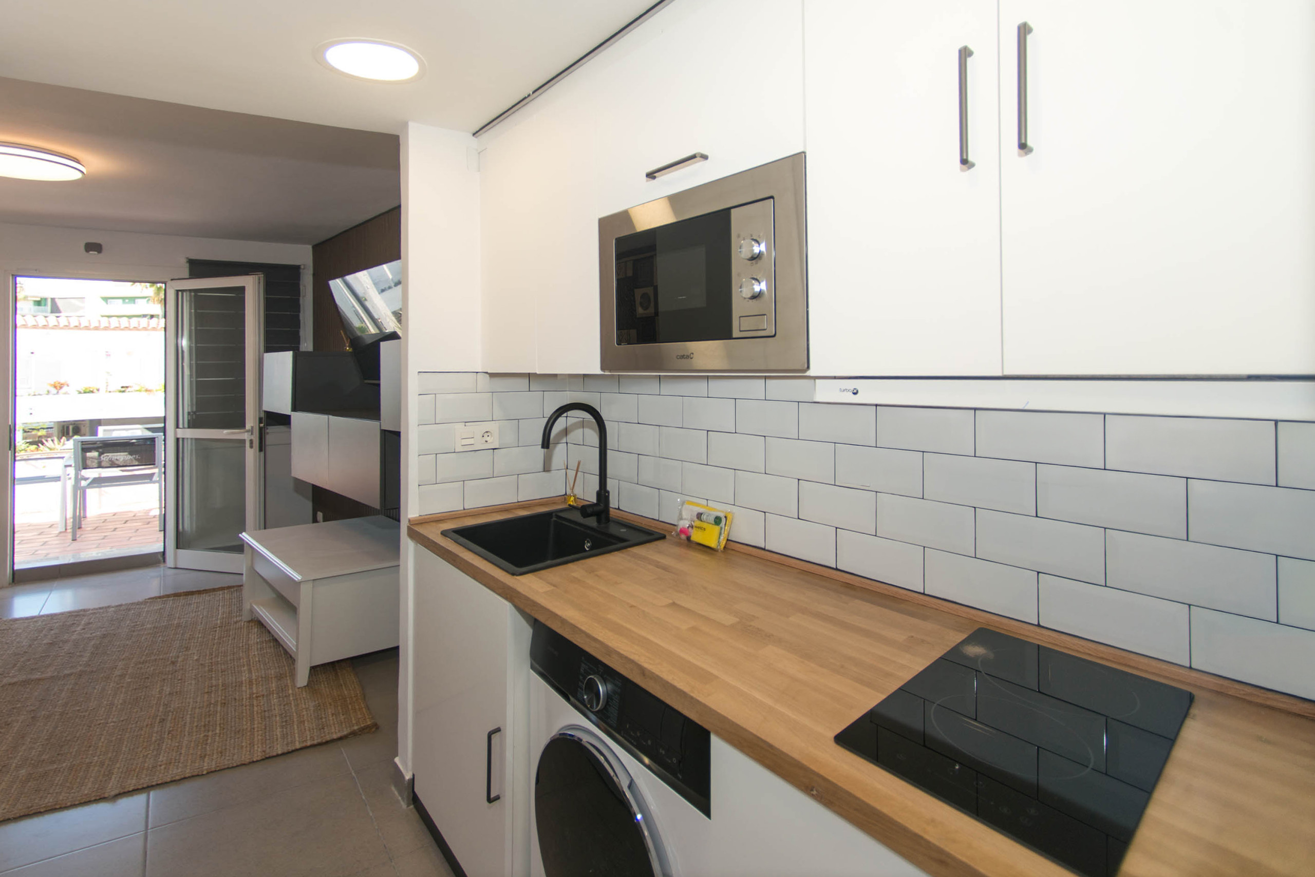 Helle Wohnung in Platja d'Aro für bis zu 4 Gäste, mit praktischer Aufteilung und einer privaten Terrasse von 10 m². Verfügt über Klimaanlage, WLAN, Waschmaschine und Gemeinschaftspool an einer bequemen Lage in der Nähe von Geschäften und Restaurants.