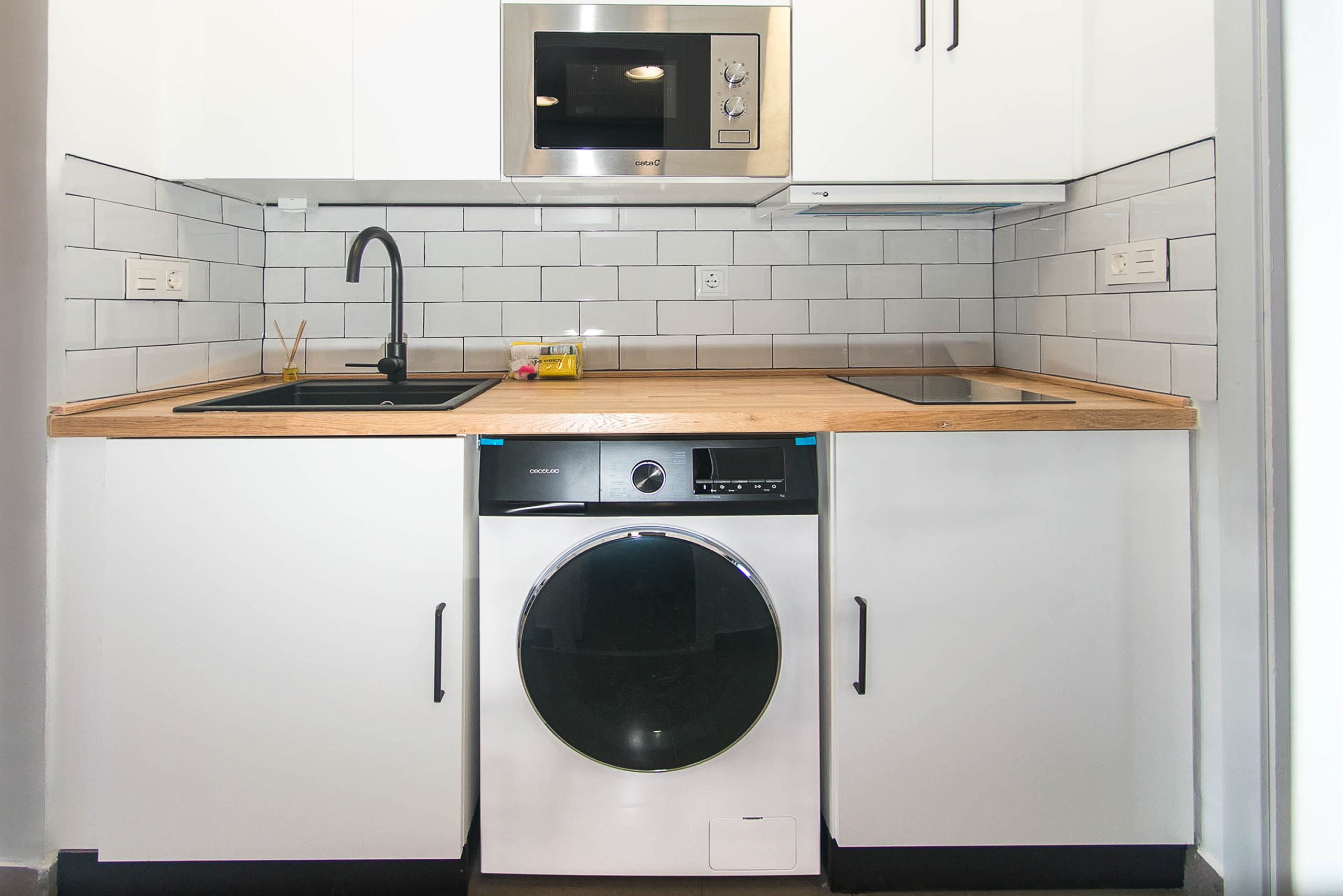 Die Küche ist komplett ausgestattet mit allem Notwendigen: Kühlschrank, Backofen, Mikrowelle, Geschirrspüler, Kaffeemaschine, Toaster und Küchenutensilien, ideal zum Zubereiten von Hausmannskost während des Aufenthalts.