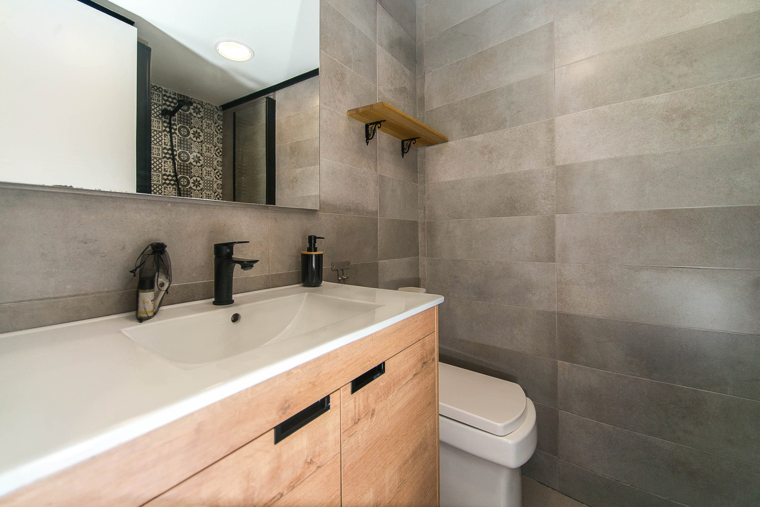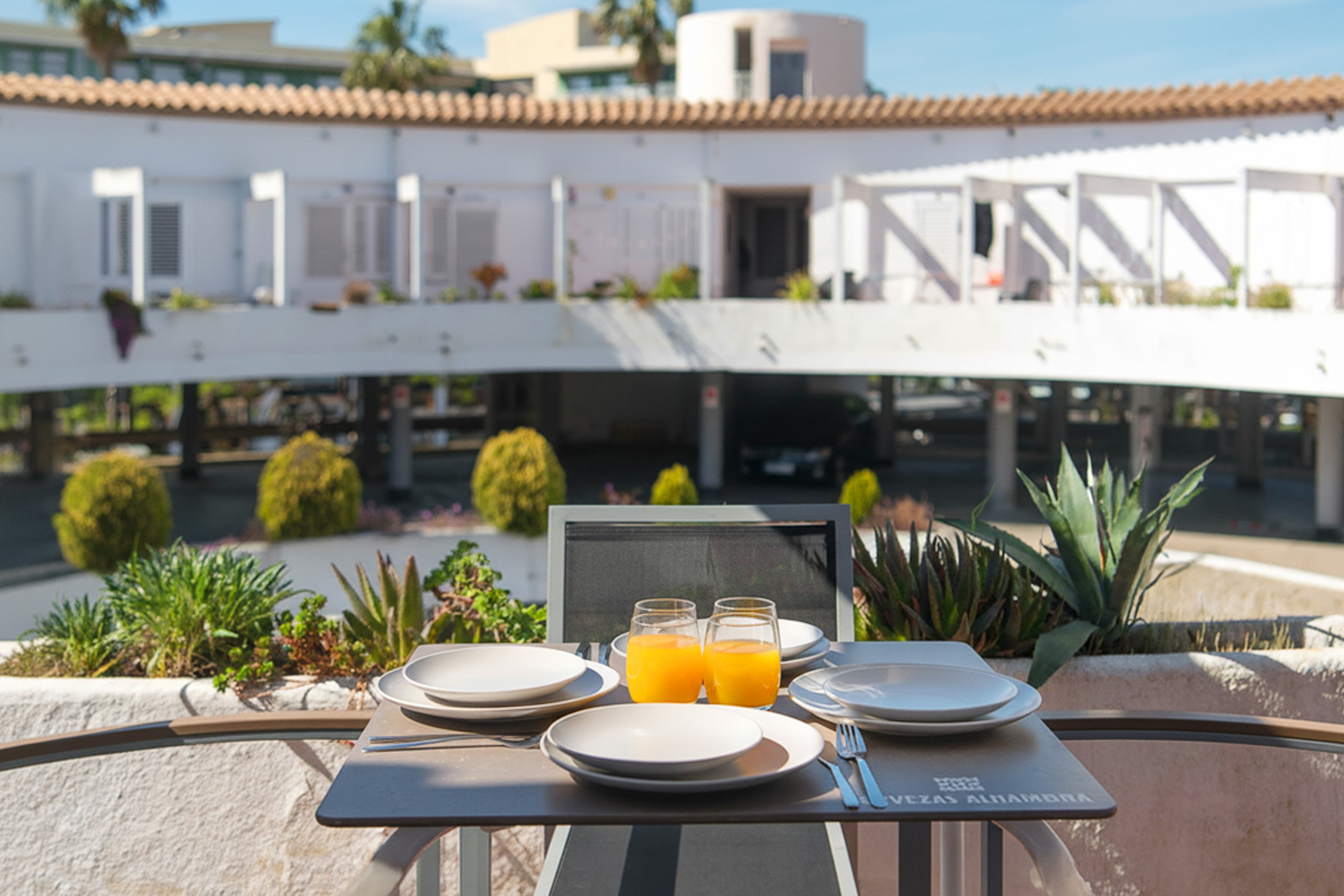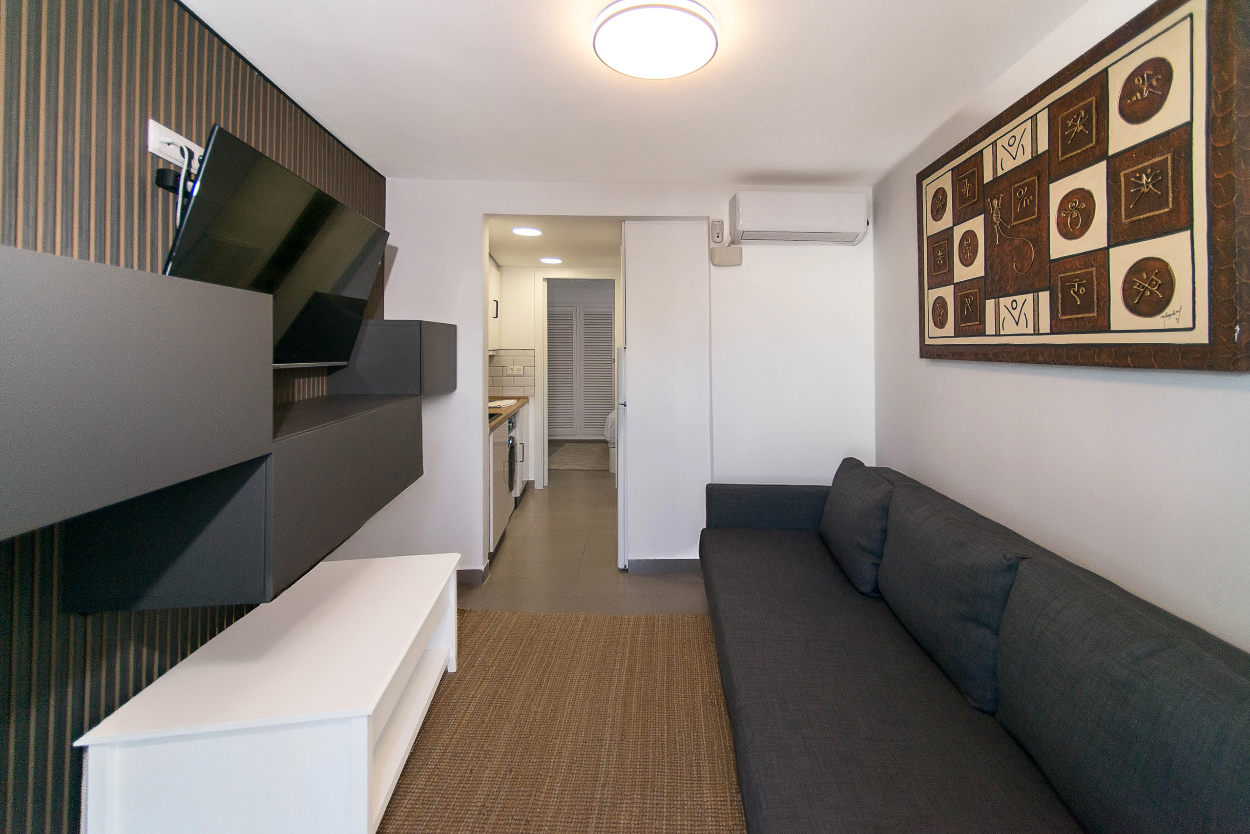 Die Unterkunft verfügt über einen geräumigen Wohn-Essbereich mit Sofa und Fernseher, der eine perfekte Atmosphäre zum Ausruhen nach einem Tag am Strand schafft. Von hier aus gelangt man auf eine private Terrasse von 14 m², die ideal zum Sonnigen Frühstücken oder zum Genießen eines Abendessens im Freien mit Blick auf die Berge und die Stadt ist.