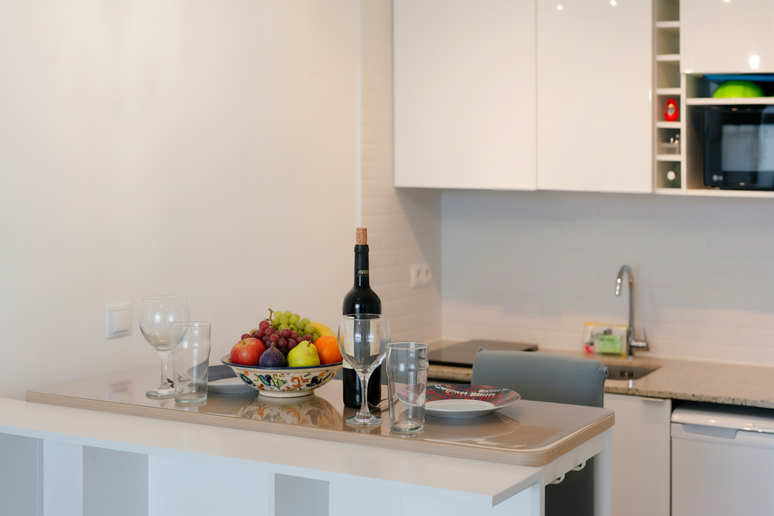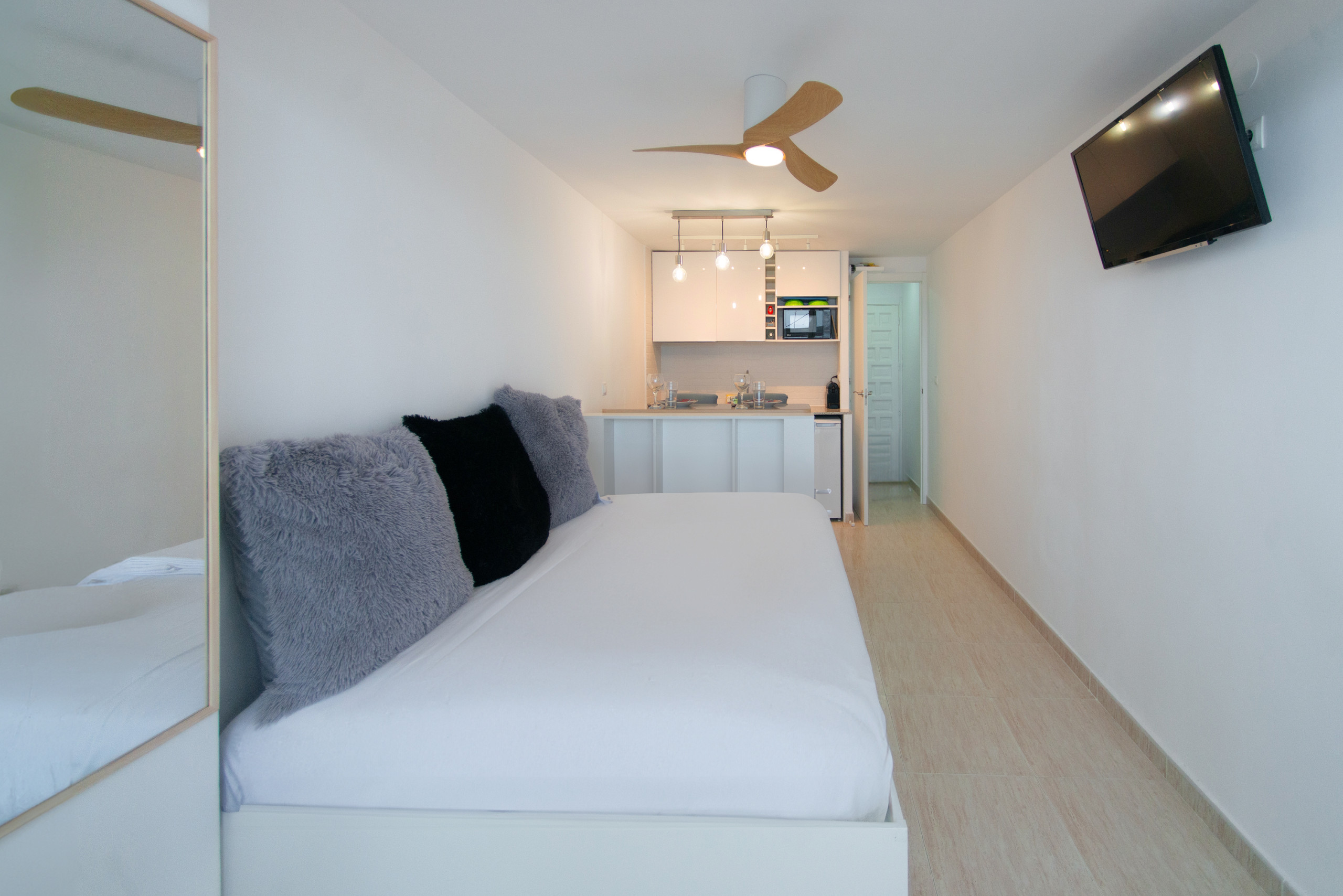 Helles Studio für 2 Personen in Platja d'Aro, mit Meerblick und praktischer Aufteilung für einen komfortablen Aufenthalt. Verfügt über ein Doppelbett, Essbereich, voll ausgestattete Küche und ein vollständiges Badezimmer. Inklusive WLAN und Waschmaschine, ideal für Ausflüge am Meer.