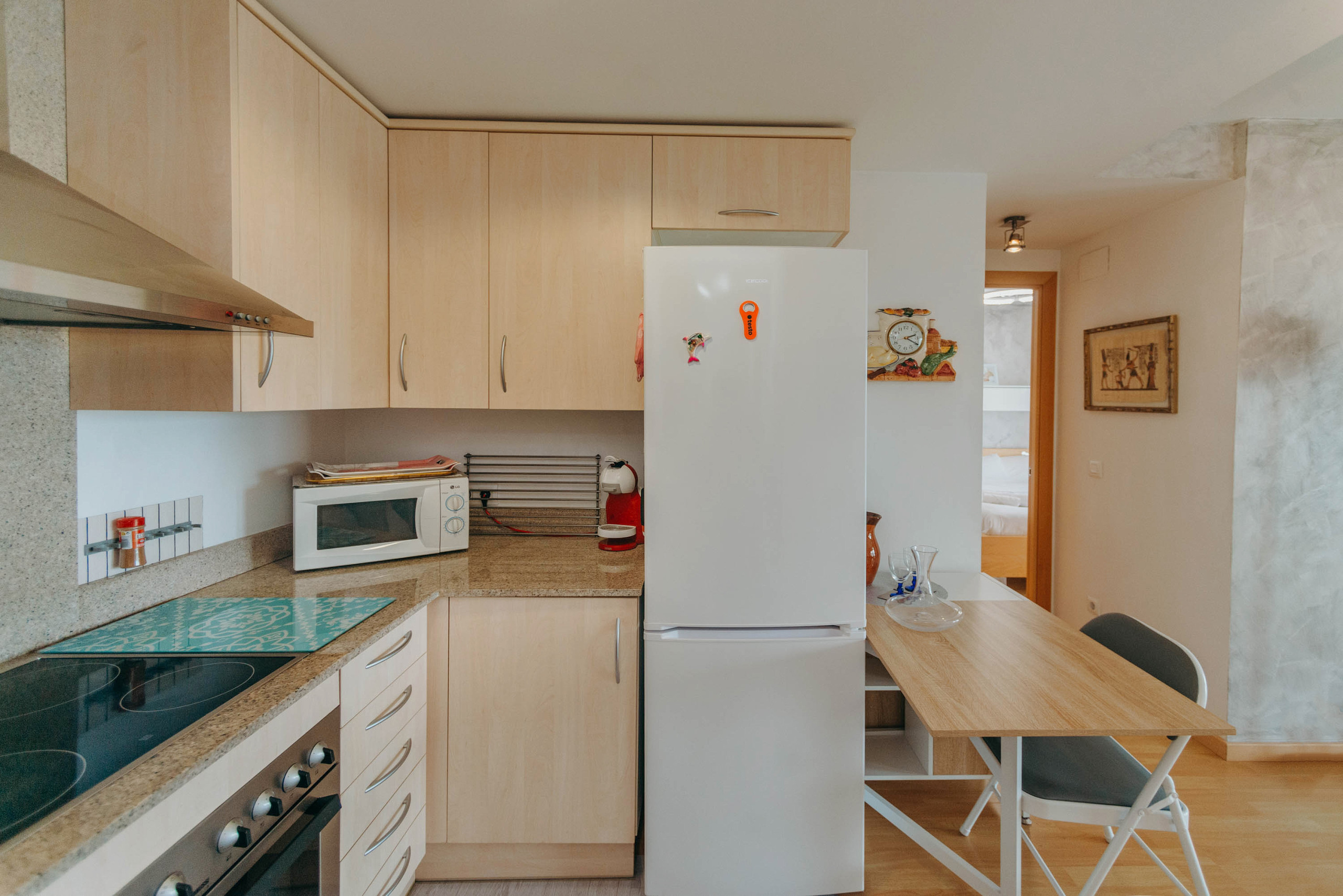Fully equipped kitchen, with refrigerator, oven, microwave, coffee maker, ceramic hob, and washing machine