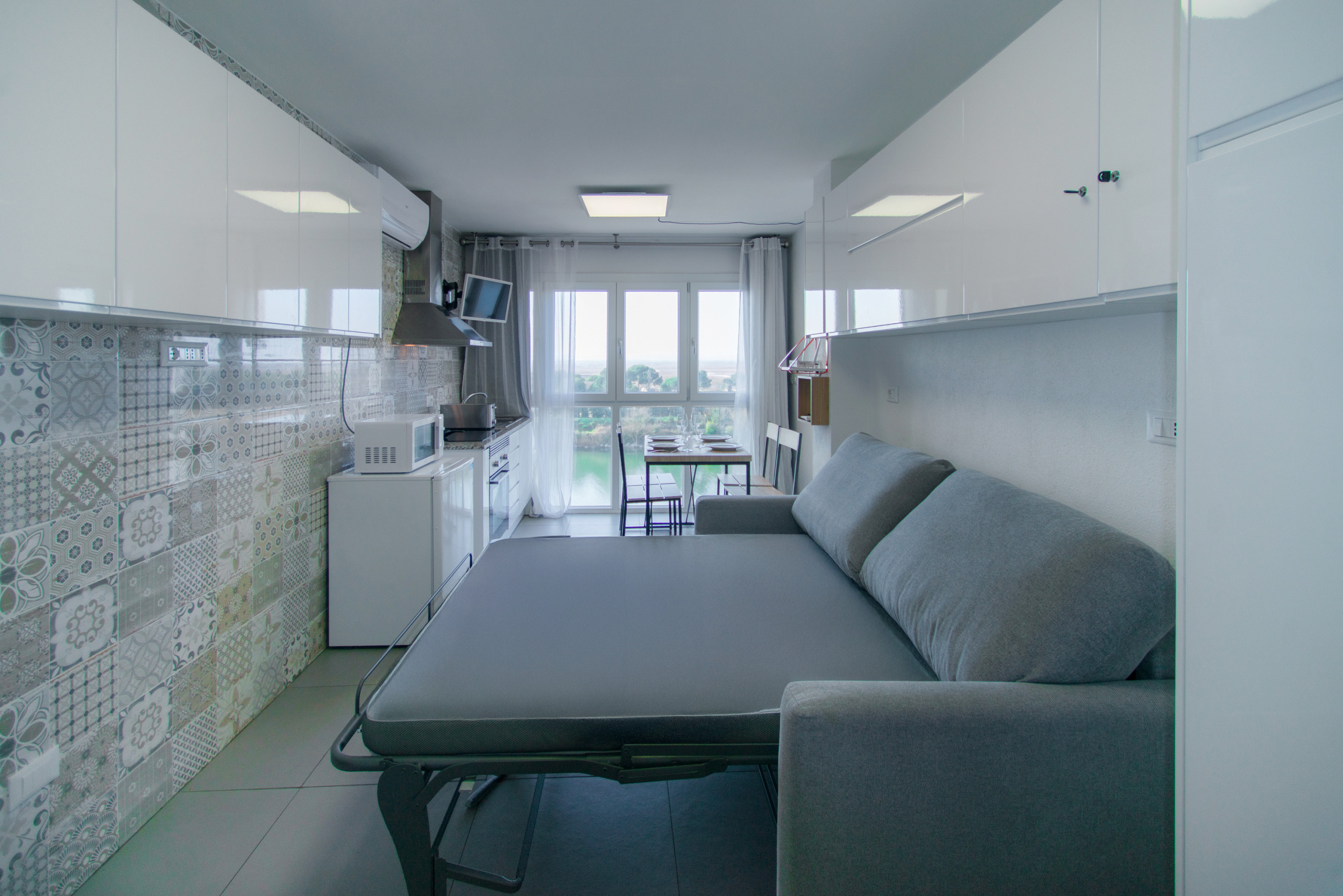 The bathroom, although compact, is equipped with everything necessary for a comfortable stay. There is a modern shower to refresh yourself after a long day under the sun. The kitchen, despite its size, is fully equipped and ready for culinary experiments. Here you will find everything needed to prepare light breakfasts or romantic dinners. But the true jewel of this studio is the terrace with views of the canal. Here you can enjoy your morning coffee while admiring the passing boats, or spend the evening with a glass of wine listening to the relaxing splash of water.
