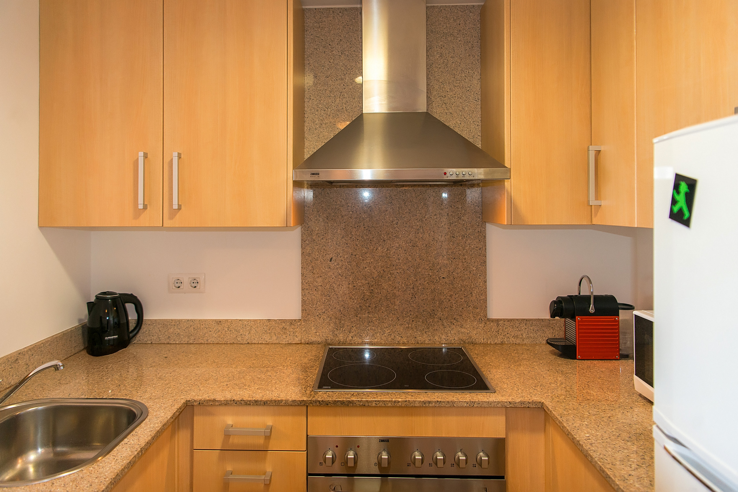 Cuisine entièrement équipée, avec réfrigérateur, four, micro-ondes, cafetière, plaque vitrocéramique et lave-linge