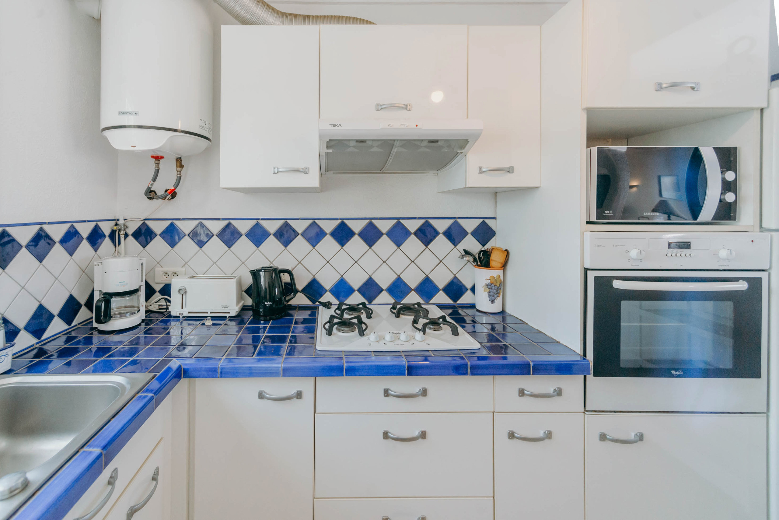 La cuisine américaine, avec plaque vitrocéramique, est équipée d'un réfrigérateur, micro-ondes, four, congélateur, lave-vaisselle, vaisselle/couverts, ustensiles/batterie de cuisine, cafetière, grille-pain et bouilloire.