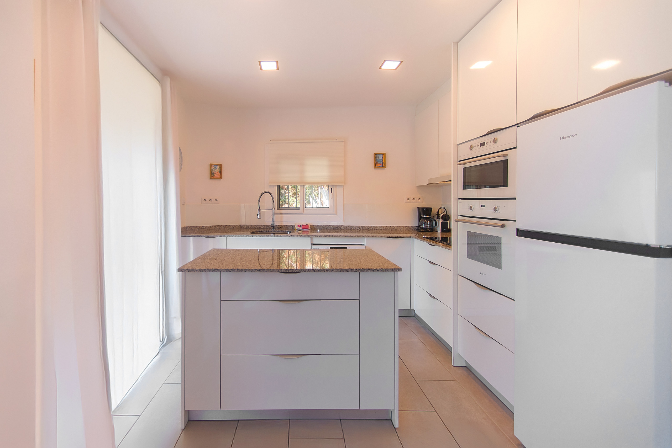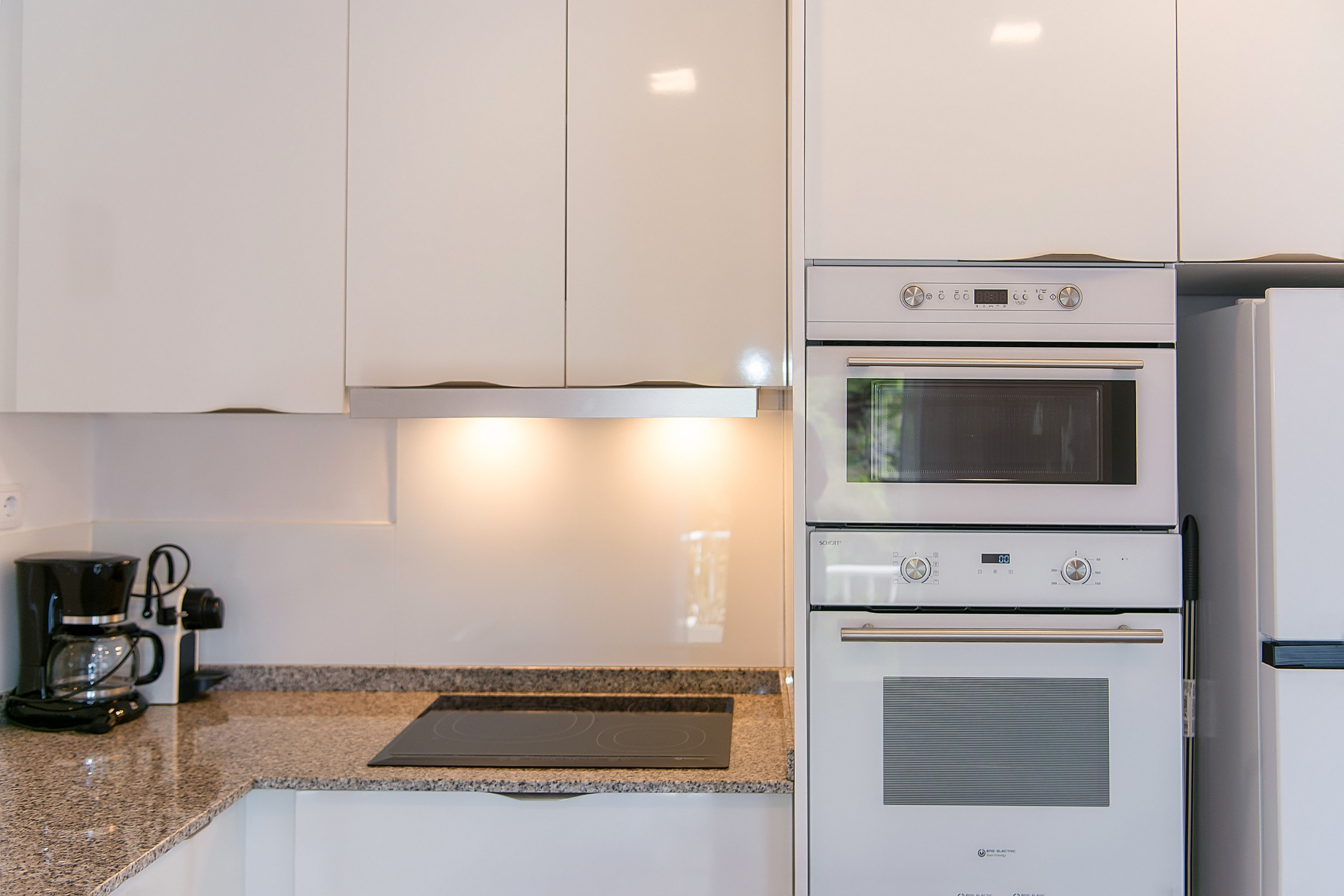 La cuisine américaine, à induction, est équipée d'un réfrigérateur, d'un micro-ondes, d'un four, d'un congélateur, d'un lave-vaisselle, de vaisselle/couverts, d'une cafetière, d'un grille-pain et d'une bouilloire.