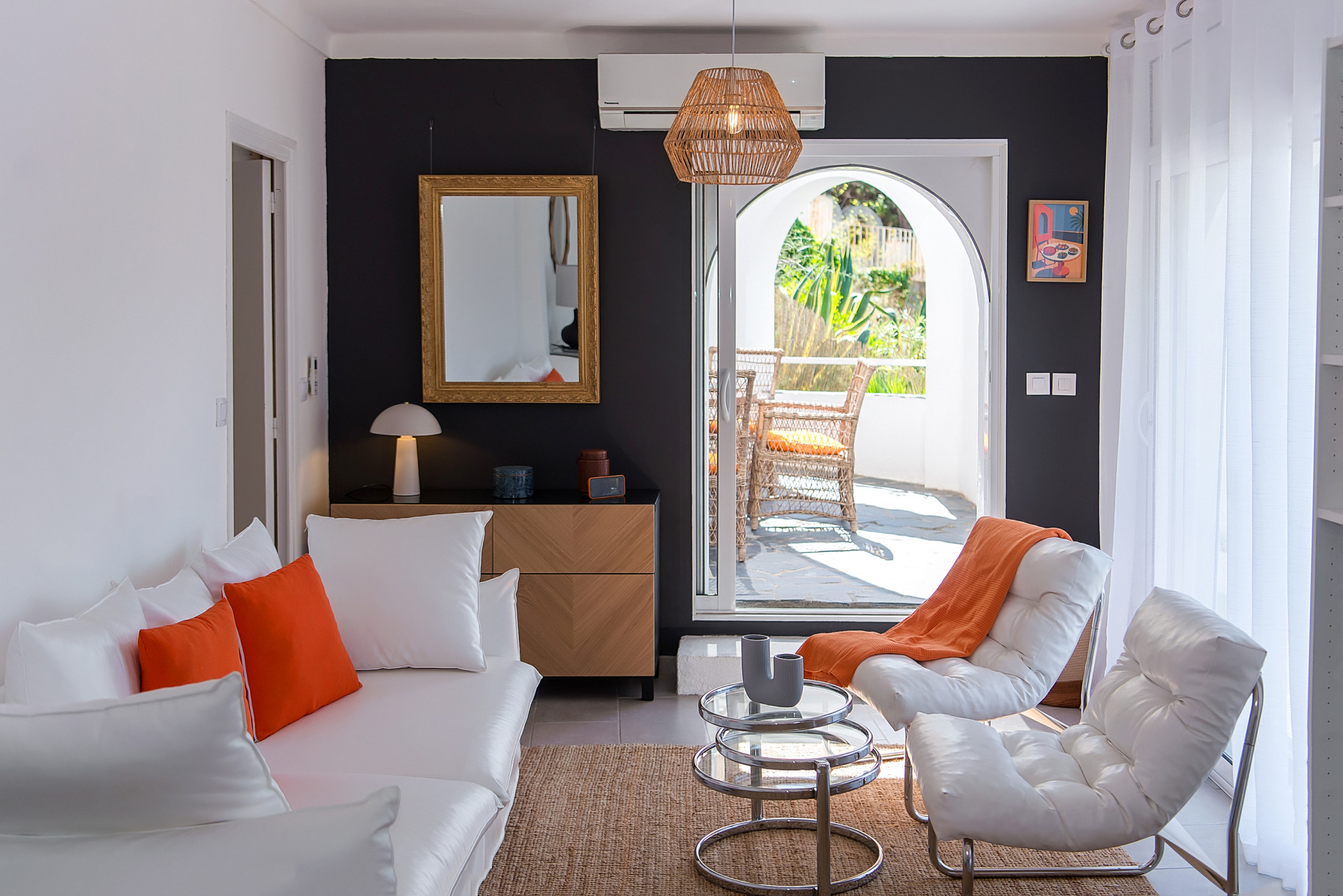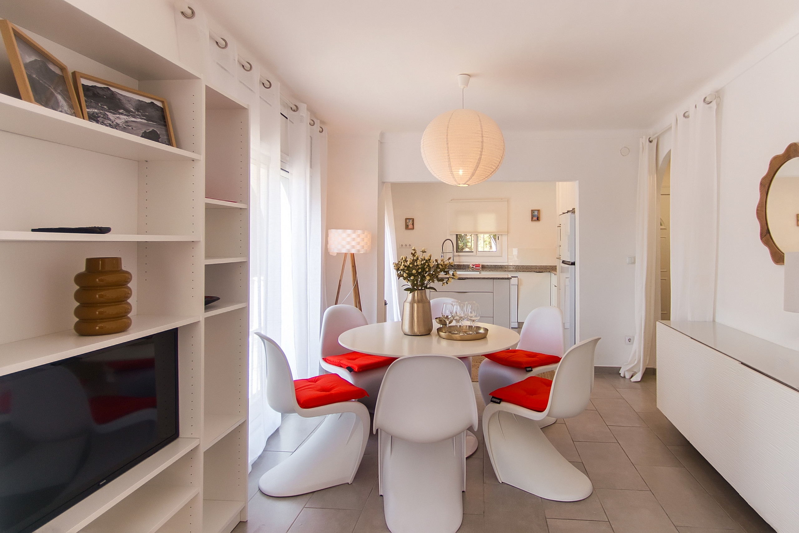 En entrant dans la maison, vous vous retrouvez dans un salon spacieux, où un canapé confortable et une télévision moderne créent un endroit parfait pour se détendre et se divertir. La zone de repas, située ici même, invite à savourer un repas en famille ou entre amis. Mais la principale attraction du salon est la sortie sur la terrasse, où des chaises longues confortables attendent de vous offrir des moments de relaxation au son des vagues de la mer.