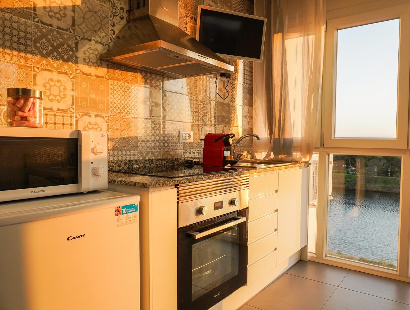 La salle de bain, bien que compacte, est équipée de tout le nécessaire pour un séjour confortable. Il y a une douche moderne pour se rafraîchir après une longue journée sous le soleil. La cuisine, malgré sa taille, est entièrement équipée et prête pour des expériences culinaires. Ici, vous trouverez tout ce dont vous avez besoin pour préparer des petits-déjeuners légers ou des dîners romantiques. Mais le véritable joyau de ce studio est la terrasse avec vue sur le canal. Ici, vous pourrez profiter de votre café matinal tout en admirant les bateaux qui passent, ou passer la soirée avec un verre de vin en écoutant le clapotis relaxant de l'eau.