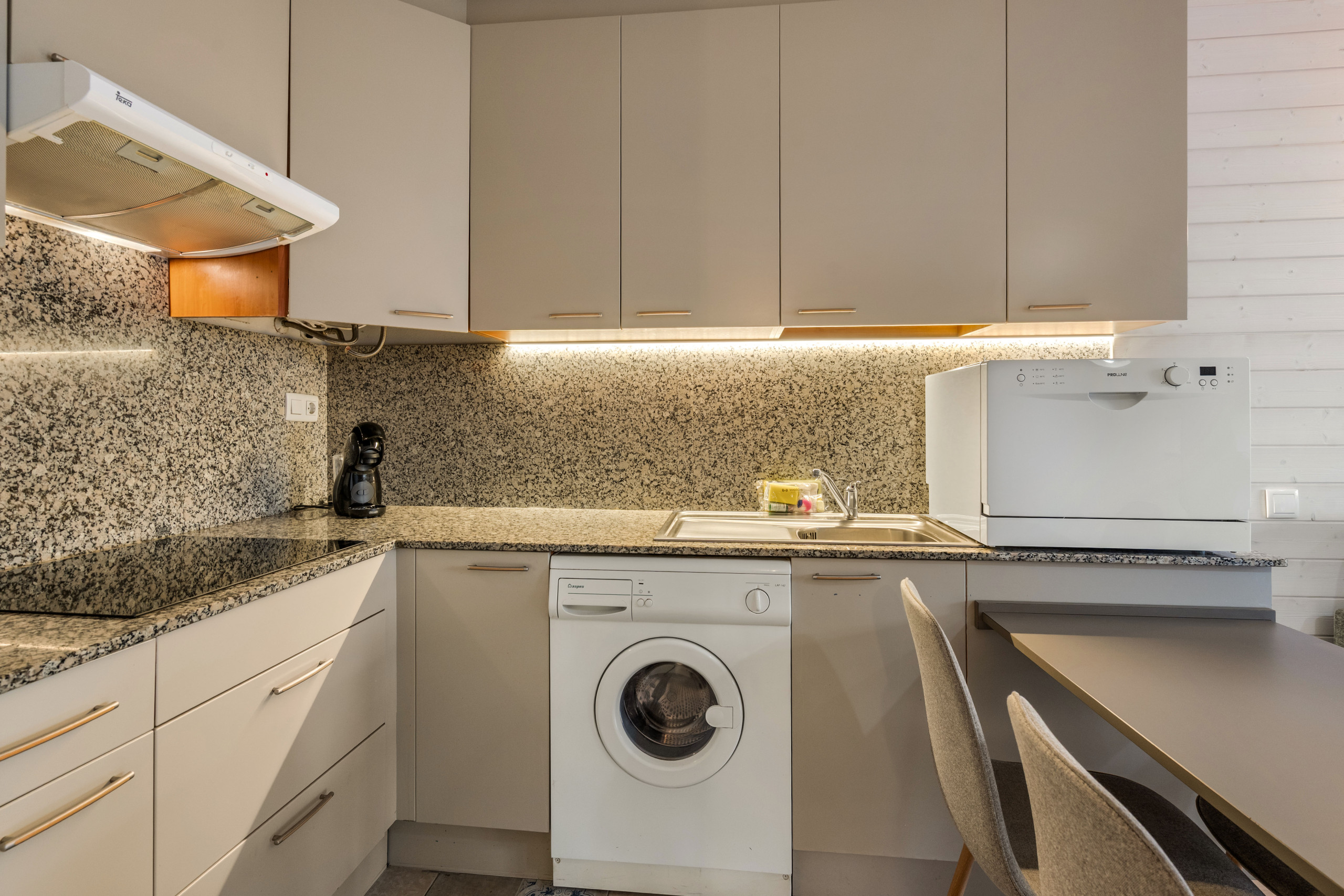 A kitchenette, está equipada com frigorífico, microondas, congelador, máquina de lavar louça, louça/talheres, utensílios/cozinha e máquina de café.