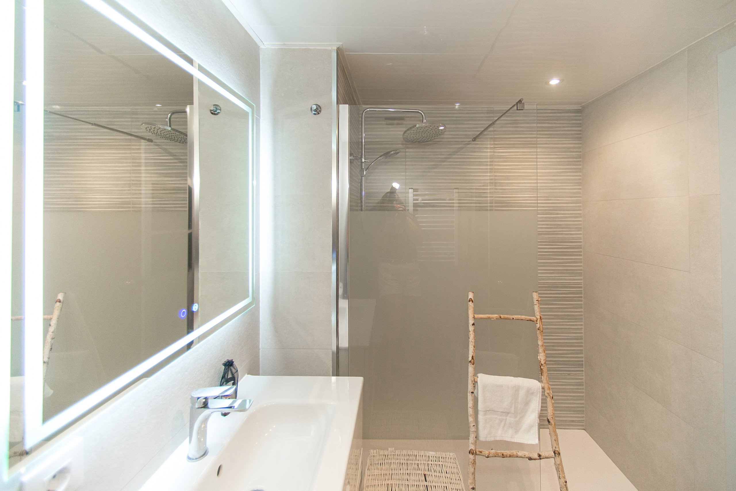 Апартаменты имеют 2 спальни и просторную гостиную-кухню с панорамными окнами, выходящими на частную террасу. Пространство рассчитано на комфортное размещение до 6 человек, со всем необходимым для приятного пребывания: 2 двуспальные кровати, двуспальный диван, обеденный стол, душ, телевизор, кондиционер, Wi-Fi и полностью оборудованная кухня с холодильником, плитой, микроволновой печью, кофеваркой, тостером, чайником и всей необходимой посудой для приготовления любимых блюд.